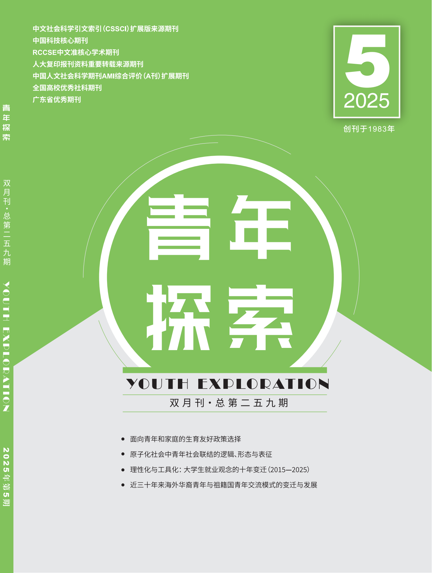 《青年探索》(双月刊)创刊于 1993 年,在共青团工作研究及青年研究领域一直享有盛誉。 入选中文社会科学引文索引扩展版来源期刊、中国人文社会科学扩展期刊、中国科技核心期刊、RCCSE 中文核心学术期刊、人大复印报刊资料重要转载来源期刊。本刊坚持学术理论研究和探索青年社会实际问题的办刊宗旨和风格,已成为全国观察青年、研究青年、反映青年、服务青年的权威窗口。